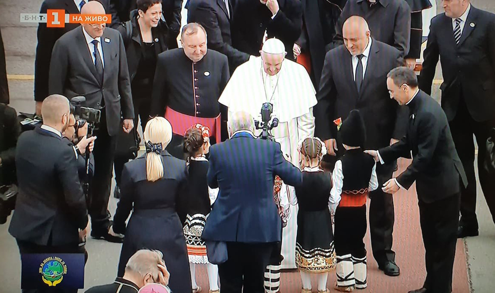 на летище „София“ от премиера Бойко Борисов, където двамата разговаряха на четири очи. Папата щe бъде официално посрещнат от държавния глава Румен Радев в Президентството в 11.00 часа.