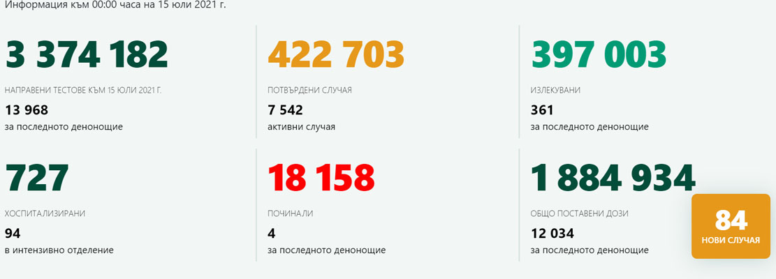 84 са новите случаи на COVID-19 при направени 13 968 теста, отчита Националната информационна система. 0,6 % от изследванията са дали положителен резултат за коронавирусна инфекция.